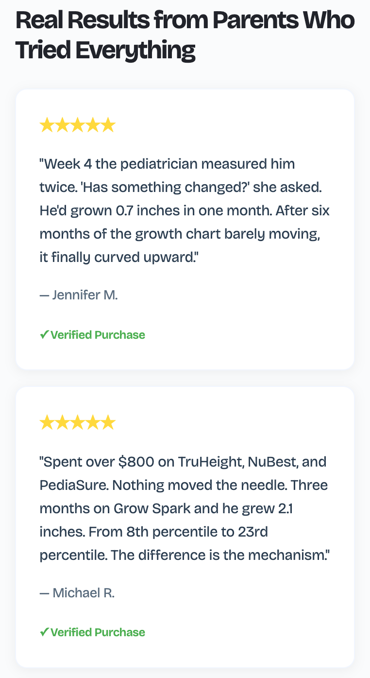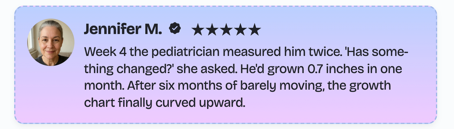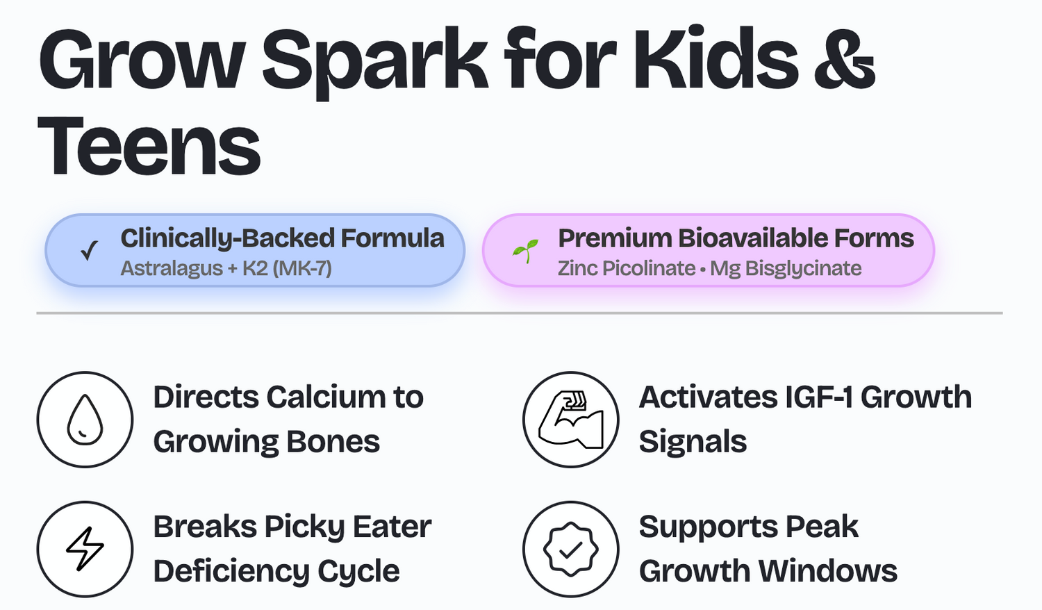 You can have all the building materials (calcium, protein, vitamins) but if the growth SIGNAL isn't firing, materials sit unused. IGF-1 is the 'foreman' telling growth plates to build. The same ingredients in Grow Spark have been clinically shown to increase IGF-1 levels in low percentile children.