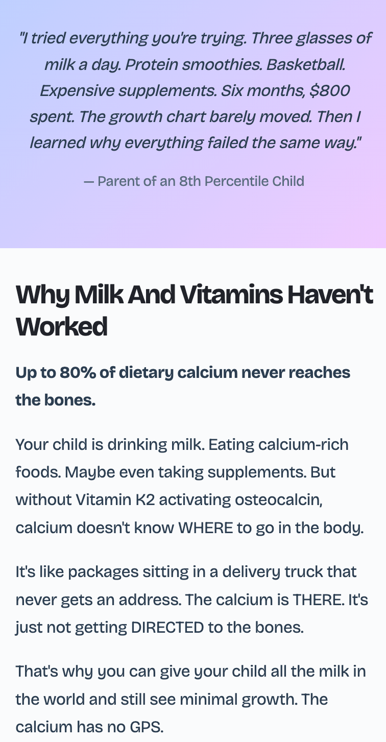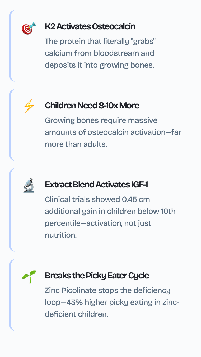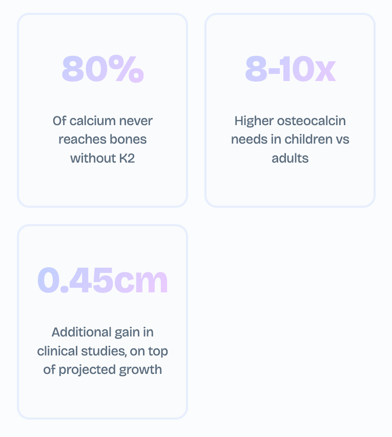 Up to 80% of dietary calcium never reaches the bones. Without Vitamin K2 activating osteocalcin, calcium has no 'GPS'—it just circulates in the bloodstream unused. Your child was probably getting enough calcium. It just wasn't getting DIRECTED to where it needed to go.