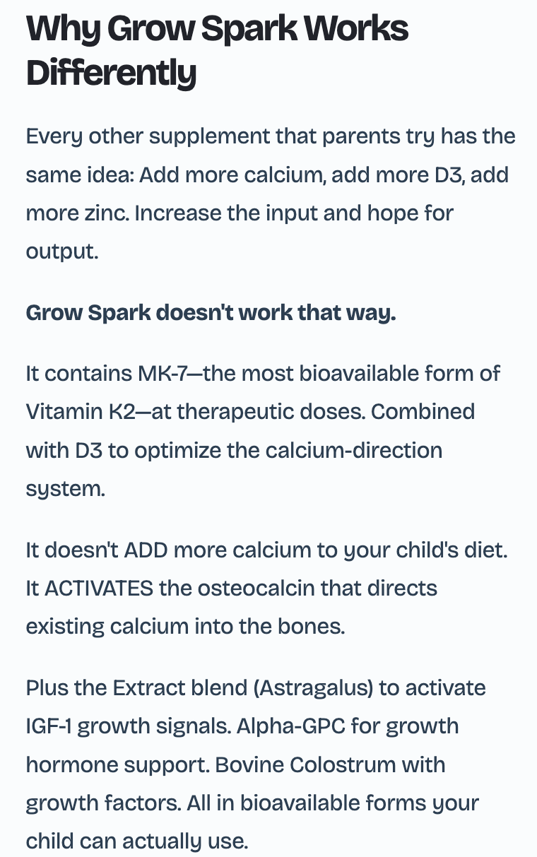 Most supplements focus on adding MORE calcium and vitamins (input). Grow Spark focuses on DIRECTING existing calcium to bones through K2-activated osteocalcin, plus activating IGF-1 growth signals through Astralagus membraneceus root extract, Eleutherococcus senticosus stem extract and Phlomis umbrosa root extract.