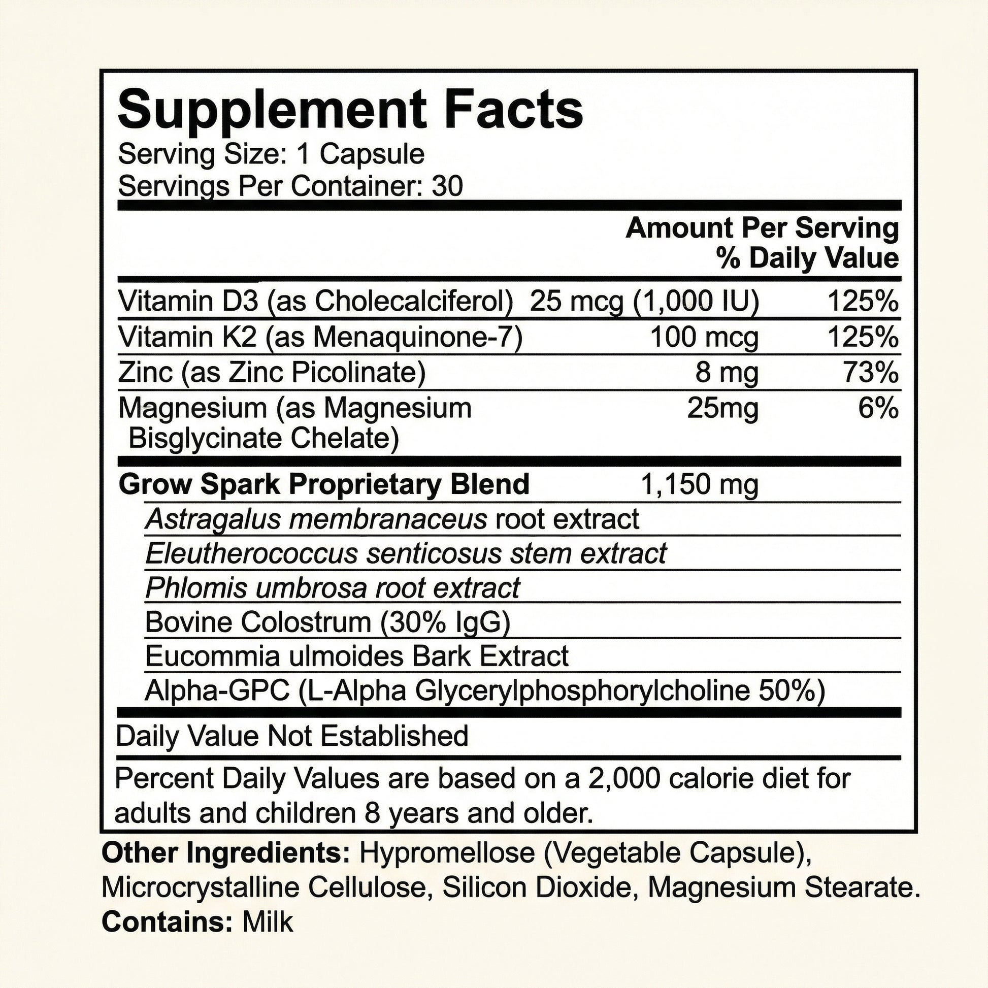 Grow Spark contains clinically-studied ingredients at safe, effective doses: Vitamin D3, K2 (MK-7), bioavailable Zinc Picolinate and Magnesium Bisglycinate, Astralagus Membraneceus root extract, Eleutherococcus Senticosus stem extract, Phlomis Umbrosa root extract, Bovine Colostrum, Alpha-GPC, and Glycine. All are well-tolerated and extensively researched.